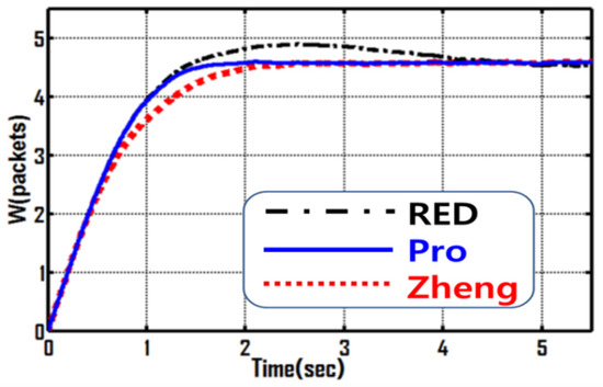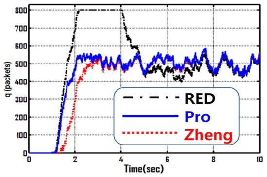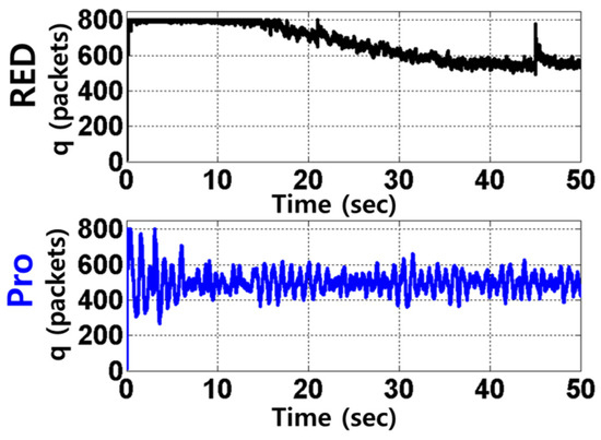 From Figure 5, we can observe that, by using the proposed congestion controller, a stable response is maintained even in the situation with disturbance (the available link capacity) and time delay (round-trip time), while the queue response of the RED method shows the buffer saturation until 17 s. The prevention of the buffer overflow is shown continuously after 3 s in the result of the proposed method.