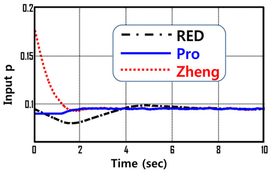 Between 0 to 8 s, the meaningful responses of the queue size and control input are listed in Table 1. The RED and proposed methods have similar rise time (80%) performances of 1.56 and 1.67 s, respectively. However, the RED method shows the worst settling time performance and buffer saturation. The settling times of control input are measured for the 1% steady state error of the operating point . The proposed method shows the fastest settling time 1.56 s in Figure 3. All of the input values remain at the operating point after 7.5 s, such that all of the queue sizes are shown as similar performances. Although the disturbance rejection level, 0.4621, achieved by the proposed controller is slightly larger than the level of 0.1719 by Zheng’s controller, the proposed controller is easier to design and implement in practice because it does not require the estimation of all states from the output.