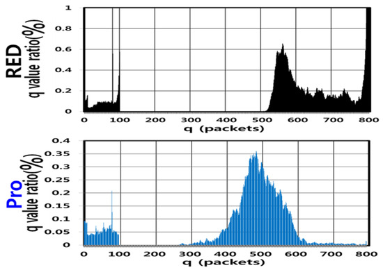 The queue size distributions in the router are described in Figure 6. The queue length of the RED method is distributed in the area larger than the desired queue length in the router because of the steady state error. The distribution near the maximum buffer size of 800 packets, especially, is caused by the buffer overflow at the starting time. On the other hand, the proposed method provides a well-balanced distribution performance, indicated by the bell shape without packet loss in Figure 6, despite the varying round-trip time delay and external disturbance (the available link capacity).