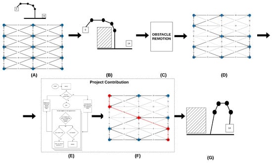 Steps required to move the robot with dynamic obstacle detection: (A) Representation of a robot and its configuration space in a graph. (B) Introduction of an obstacle into the environment. (C) Implementation of a technique to eliminate obstacles from the graph. (D) Resulting free space after obstacle removal. (E) Proposal for parallelization of the shortest path and removal of nodes. (F) Determination of the optimal path for the robot to traverse. (G) Execution of the configuration sequence by the robot.