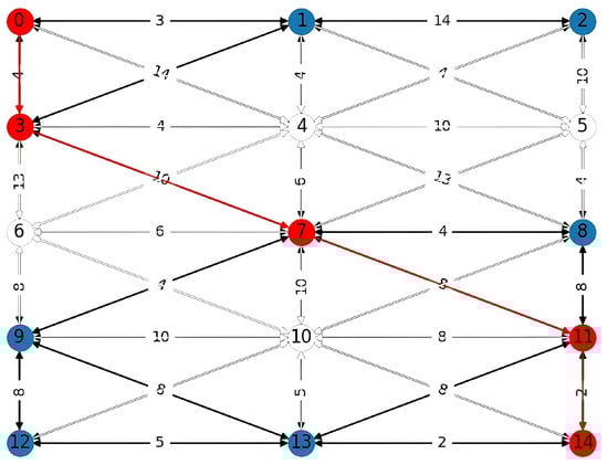 Additionally, a base version of the Dijkstra algorithm was developed and tested using Python. This version served as a base model for validating the results obtained in the optimized versions. The results of the base version were extensively tested and validated. The tool generates images that represent the constructed graph and the shortest path found (as shown in Figure 2). These images are created using the matplotlib library [32] and serve as a support method in the process of validating the results.