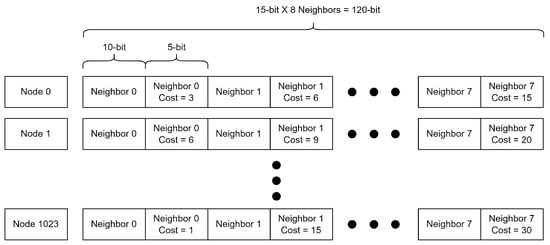 Structure of the adjacency list. Here, a list with 1023 nodes (10-bit representation) was created, each one having up to 8 neighbors with a maximum cost of 31 (5-bit). Each entry in the list comprises a 120-bit word.