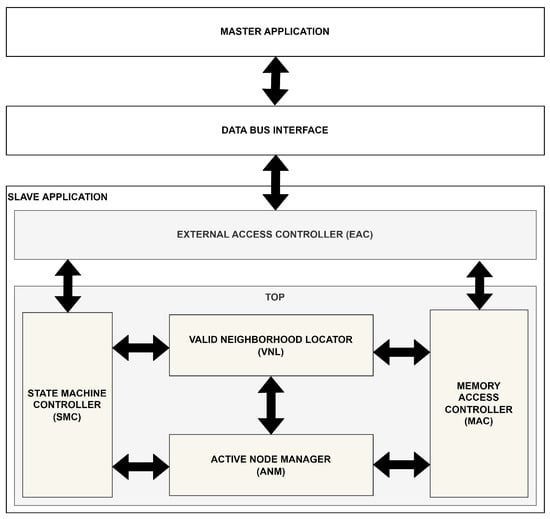 Internally, the slave implemented an adapted version of the solution proposed by [29]. The simulation results presented little difference between the IN, OUT, and INOUT selection criteria regarding the number of approved nodes by iteration. However, due to its classification method, the IN criterion needed a more complex structure with additional memory access, as previously explained. Thus, to reduce resource consumption, the architectural proposal outlined here employed solely the OUT criterion as the classification method.