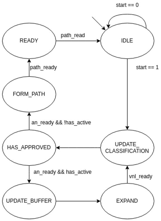 The SMC implements a Finite State Machine (FSM) with seven states (see Figure 10): (i) IDLE; (ii) UPDATE_CLASSIFICATION; (iii) EXPAND; (iv) UPDATE_BUFFER; (v) HAS_APPROVED; (vi) FORM_PATH; and (vii) READY.