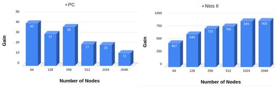 The results obtained with the two reference models, along with the results achieved in the proposed solution with the best clock obtained for each graph size, can be seen in Table 11. The last two columns of the table demonstrate the gains obtained. For all cases, the proposed application demonstrated superior performance. These gains are also shown in Figure 11.
