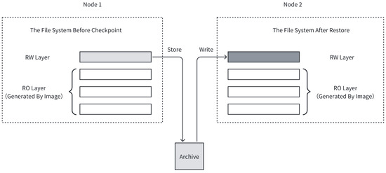 The filesystem of a container is normally built in layers by a union filesystem [19]. First, the image layers of the container are stacked into read-only layers. Then the container runtime generates a temporary read–write directory mounted on top of the read-only layers of the image. Changes made by the container to the filesystem during its execution only occur in the topmost read–write layer. When checkpointing the filesystem of the container, the read-only layers can be directly migrated through images. In contrast, the read–write layer should save its contents to an archive file when checkpointing the container, such as the container runtime’s changes to the filesystem. When restoring the container, the archived file is rewritten into a new read–write layer. The checkpointing and restoration processes of the filesystem migration methods are described in Figure 1.