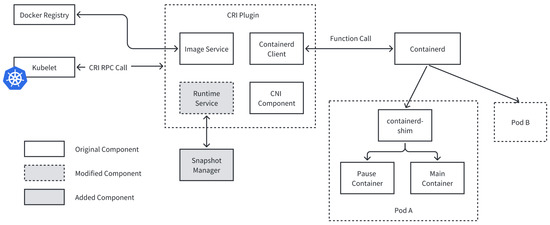 - “Creating Function”. This function listens to the “Create Container” interface in the CRI service. It allows for the preparation of container snapshot files locally by querying the “snapshot manager” when Kubelet creates a container; moreover, it pulls the archived file of the read–write layer of the previous container’s filesystem from a remote service, and writes it into the read–write layer of the new container’s filesystem.