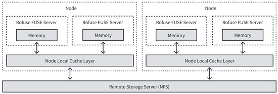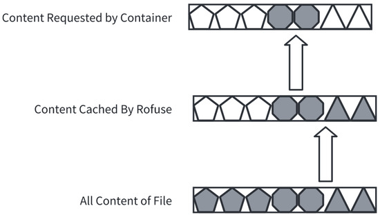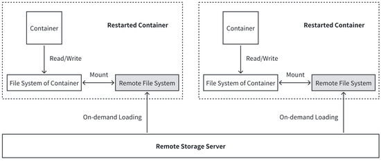 In the base framework, the recovery of the container filesystem includes two parts: (1) fully downloading and decompressing the container’s initial image; (2) fully downloading the read–write layer archive file of the old container, decompressing it, and writing it to the read–write layer of the new container’s filesystem. Harter et al. demonstrated in Slacker experiments that only 6.4% of image data are used during container startup [21], so it is unnecessary to fully download these files of the two parts at container startup. Therefore, Rofuse constructs a remote filesystem to implement on-demand loading of the container filesystem after restart. The working diagram of this remote filesystem is shown in Figure 3.