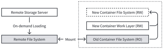A unified filesystem can mount multiple filesystems located at different physical locations into a single virtual file tree to form an integrated view that achieves seamless overlaying of files and directories. As described in Figure 4, Rofuse divides the filesystem of a new container into two parts, where the base layer is the filesystem of the old container and is set as read-only mode. However, the top layer, dedicated to the new container, possesses read–write capabilities. Rofuse uses the unified filesystem technique to merge the two layers of filesystems into one and mount it under the root filesystem directory of the new container to build a complete filesystem with read–write functionality. This filesystem hierarchy remains completely transparent to the container, ensuring that the container processes perceive only a complete and unified root directory. When a container process attempts to read a file, the read request will be passed down to the “filesystem layer of the old container” and ultimately loaded on demand through the remote filesystem.