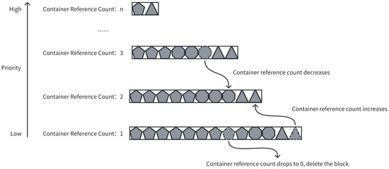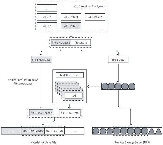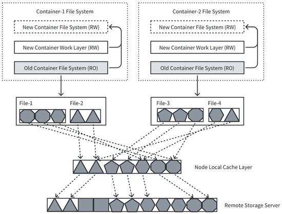 In Figure 5, the files in the “old container filesystem” layer of container-1 and container-2 have undergone a chunking process. These data blocks are then hashed, and the blocks with the same hash value are stored and shared in the local cache layer of the node, which is adaptable for a CAS (content-addressable storage) strategy using the hash value of the data block to determine its storage location. Across different nodes, the information of the data blocks in the cache layer originates from the remote storage server. The specific working mechanism of this process will be discussed in detail in the next section.
