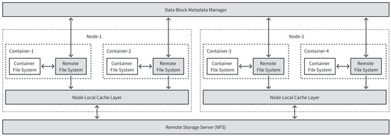 - Remote storage server. This component also works on the cluster level and is responsible for storing the data blocks of all container files. In this paper, we use NFS as the specific implementation of the remote storage server.