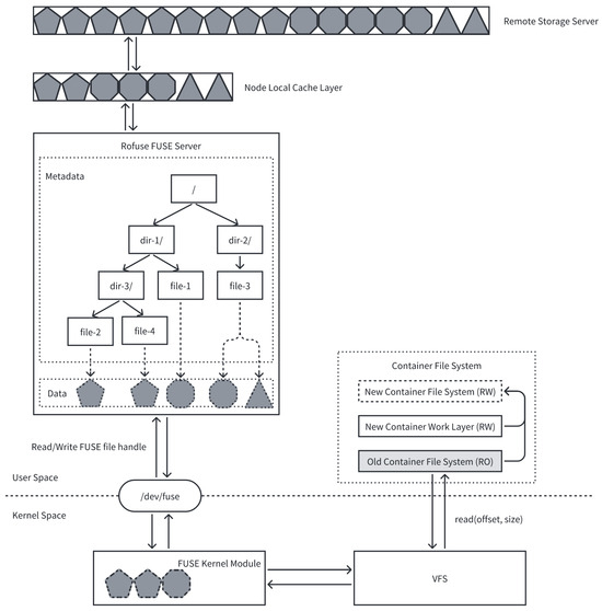 The Rofuse remote filesystem is a read-only FUSE filesystem. It is the core component of Rofuse. Its architectural diagram is shown in Figure 7. Upon container restart, an instance of the Rofuse remote filesystem is generated. This instance mounts itself into the “old container filesystem” layer through the kernel FUSE module. Consequently, read operations initiated from the union filesystem toward the old container files are redirected to the Rofuse remote filesystem.