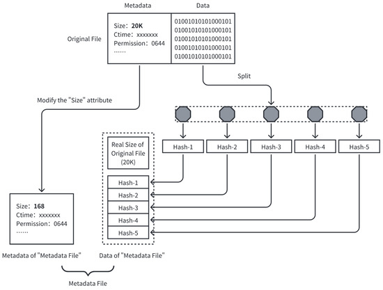 In Figure 11, a regular file is split into a “metadata file” and several data blocks. During the processing, the data part of the file is handled first. Taking a 20 KB file as an example, Rofuse splits its data part into five 4 KB data blocks. Subsequently, Rofuse applies the SHA-256 hashing algorithm to each data block, generating five 32-byte hash values. These hash values, along with the original file size of 20 KB (expressed as a 64-bit integer), are then compiled into a 168-byte sequence. This byte sequence forms the data of the new “metadata file”. Next, the original file’s metadata attribute for file size is modified to 168, creating the metadata part of the “metadata file”, thereby completing the creation of the full “metadata file”. In particular, for sparse files stored in a sparse format on disk, the zero-value parts of the file consistently yield a fixed hash value after being processed by the hashing algorithm when split into data blocks. Since the remote storage server uses a CAS approach to store data block files, the zero-value parts of different sparse files share the same data block representation and do not cause additional storage overhead.