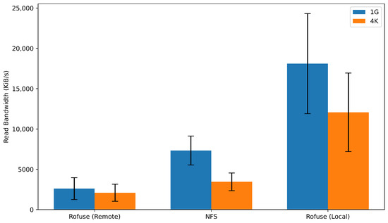 To evaluate the performance of the Rofuse remote filesystem, we first conducted benchmark tests using the standard testing tool FIO. On the one hand, the Rofuse remote filesystem is a read-only filesystem, primarily responsible for handling file read operations. On the other hand, even in scenarios involving file writes, the use case involves mounting through a union filesystem, where write operations to the mounted directory are directly reflected in the read–write layer of the union filesystem. In this case, the Rofuse remote filesystem still only needs to handle read requests, and the write operations are performed using the copy-on-write approach, with the write performance depending on the read performance of the Rofuse remote filesystem. Therefore, we conducted read performance tests on the Rofuse remote filesystem in two scenarios: one with 1G large files and another with 4K small files. In both scenarios, we used direct I/O for sequential reads. The performances of testing targets, including Rofuse with an empty local cache, Rofuse with all reads hitting the local cache, and NFS, are shown in Figure 13.