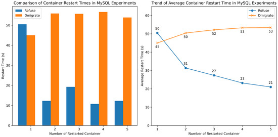 Comparison of the average restart time for containers on the same node as the number of containers varies between Rofuse and Dmigrate in MySQL experiments.