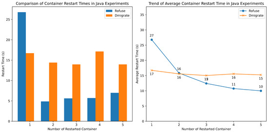 The difference in restart time in the container between Rofuse and Dmigrate in Java experiments.