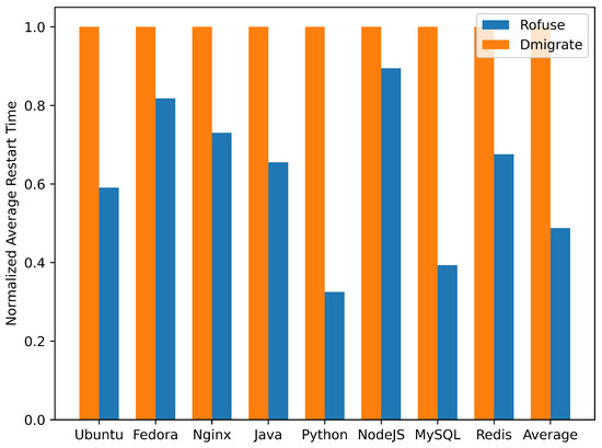 As the specific restart time varies in different application scenarios, the time consumed on the container of the Dmigrate benchmark group is normalized to 1 to compare the differences between Rofuse and Dmigrate after optimization. As shown in Figure 16, the average restart time of Rofuse consumes less than Dmigrate in different application scenarios, reducing the average container restart time by 51.19%.
