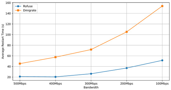 To compare the performance differences between Rofuse and Dmigrate under various network conditions, we examined the impact of different NFS downstream bandwidths on the time required for container restarts in both systems. The experimental results are depicted in Figure 17, which shows the average time taken to restart five containers on the same node.