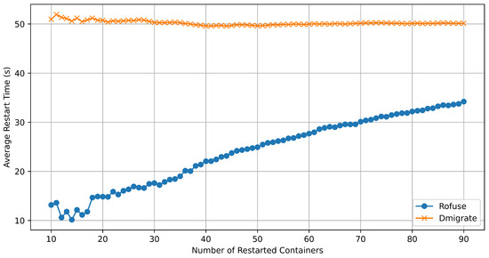 To verify the scalability performance of Rofuse under different container scales, we tested the change in average container restart times when restarting different container numbers in the same node (up to 90 containers, slightly lower than the maximum number of Pods per node recommended by Kubernetes), and compared it with Dmigrate. The results are shown in Figure 18.