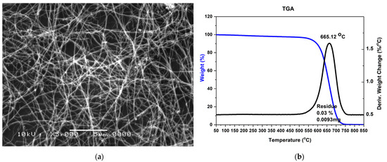 (a) SEM image of carbon nanotube material directly from synthesis after dispersion in trichloromethane in ultrasonic bath (30 min) and placement on Si wafer using drop-casting technique; (b) TGA plot of deposit from synthesis—high purity of the material achieved; residue is only 0.03% of weight.
