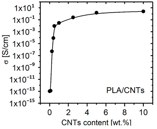 Percolation plot, log–log scale—PLA/CNT nanocomposites’ specific conductivity vs. CNT weight content [3].