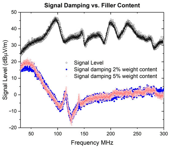 The electromagnetic radiation shielding properties of carbon nanotube (CNT)–polymer nanocomposites at filler concentrations of 2% and 5% by weight were examined, within a range of 30 to 300 MHz. This range is critical, as it encompasses frequencies common in both consumer electronics and industrial applications, making the findings highly relevant to practical implementations. The plotted results, which are discussed in detail in the corresponding sections, demonstrate the material’s effectiveness in signal damping, highlighting how different filler concentrations influence the shielding efficiency. The data gathered from these experiments not only validate the shielding capabilities of the nanocomposites but also inform potential optimizations in the filler content for cost-effective production without compromising on performance. This comprehensive setup diagram and description are intended to provide clarity on the experimental process, helping to correlate the material’s composition with its functional properties in electromagnetic radiation shielding. Examination of the samples was conducted at two different filler concentrations—2% and 5% by weight—so that the goals of high electrical conductivity (0.13 and 1.7 S/cm, accordingly [3]), allowing for effective electric charge dissipation, and electromagnetic radiation shielding could be achieved. The plot of the signal level versus the frequency of the transmitted signals shown below shows good damping properties at both examined filler concentrations—see Figure 6.