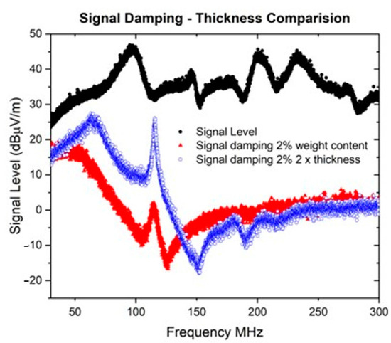 This figure visually represents the results on the signal damping effectiveness across different concentrations of carbon nanotube (CNT) filler in polymer nanocomposite layers deposited on a glass surface. The data plotted in the figure reflect experiments conducted with filler concentrations of 2% and 5% by weight. These concentrations were chosen to assess the shielding performance at lower and moderately increased filler levels, demonstrating the material’s ability to dampen electromagnetic signals effectively within the frequency range of 30 to 300 MHz. The graph highlights a notable observation: increasing the filler content from 2% to 5% does not proportionately enhance the shielding properties within the tested frequency range. This finding is crucial, as it suggests that even at lower filler concentrations the nanocomposite material achieves sufficient electromagnetic interference (EMI) shielding, making it both cost-effective and efficient in applications requiring EMI protection. The absence of a significant shielding improvement at higher concentrations could guide future material engineering by optimizing the balance between the material cost and performance. By demonstrating effective signal damping at a lower filler concentration, this study supports the development of lightweight, cost-efficient shielding materials suitable for widespread use in electronic devices, potentially lowering the manufacturing costs while maintaining high performance in electromagnetic protection. For more desirable (from an industrial application point of view) results, the shielding properties were examined against the layer thickness. For the experiment, two different layer thicknesses were examined—100 μm and 200 μm. The results can be seen in Figure 7.
