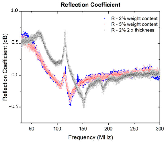 A higher reflection coefficient indicates that more of the incident wave energy is bounced back from the material’s surface, which can prevent the wave from penetrating the material. For the examined specimens, higher coefficient values could be observed in the frequency range between 30 and 130 MHz.