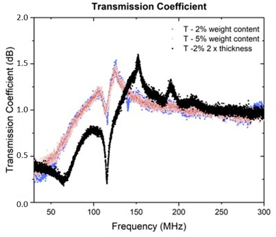 A lower transmission coefficient value, which indicates better shielding effectiveness, as less energy from the wave passes through the material, could be observed in the range described above, as illustrated in Figure 9 below.