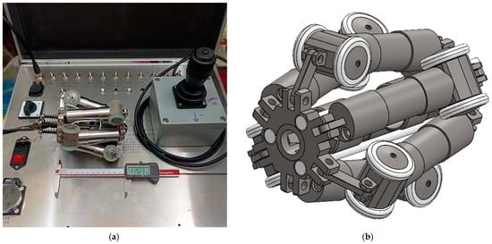The design of the pipeline robot’s structure is primarily aimed at facilitating its movement within the pipeline, requiring the coordinated cooperation of various mechanical modules. As shown in Figure 1a,b, the pipeline robot proposed in this paper, which is named π-II, includes the central framework mechanism, locomotion mechanism, and support mechanism.
