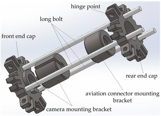 Due to space limitations within the pipeline, the central framework mechanism needs to assist in accommodating various other functionalities, such as carrying inspection sensors. Common examples include underground CCTV visual systems [26] or CCD cameras [27], as well as leak detection or ultrasonic inspection systems [28], which are typically compact to fit onto the robot. As shown in Figure 2, fixed brackets for cameras or other sensors can be installed within the central framework mechanism. If waterproofing is required, aviation plug mounting bases can be set up to protect the power lines of miniature motors.