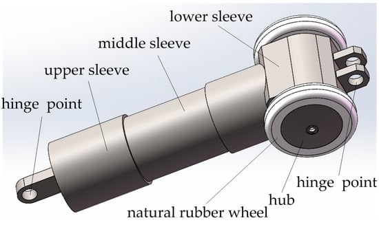 The locomotion mechanism primarily provides the robot with the power to move forward. As shown in Figure 3, this paper refers to existing solutions [5] and further improves the structure to adapt to pipeline diameters as small as 120 mm. Additionally, considering the potential future use of ultrasonic sensors, the design incorporates waterproof capabilities. Combining Figure 1, Figure 2 and Figure 3, it can be observed that the locomotion mechanism of this pipeline robot employs six identical modular structures, referred to as wheeled-leg units, which are articulated in an alternating pattern on the front and rear end caps. Each leg encapsulates a miniature DC motor, which is enclosed within three sleeves: upper, middle, and lower sleeves.