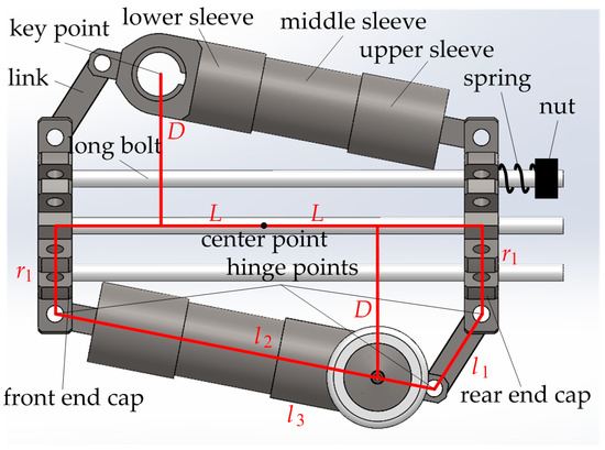 where , as r1 is the distance from the center of the front or rear end cap to the point where they articulate with the upper sleeve or link, l1 is the distance between the two articulation points of the link, l2 is the distance from the articulation point of the upper sleeve to that of the lower sleeve in the same wheeled leg, and l3 is the distance from the articulation point of the upper sleeve to the key point of the same wheeled leg. All of them are measurable structural parameters. D is the distance from the key point to the centerline of the robot, and 2L is the projection length between the key points of two staggered legs in the direction of the centerline of the robot. These two are variables.