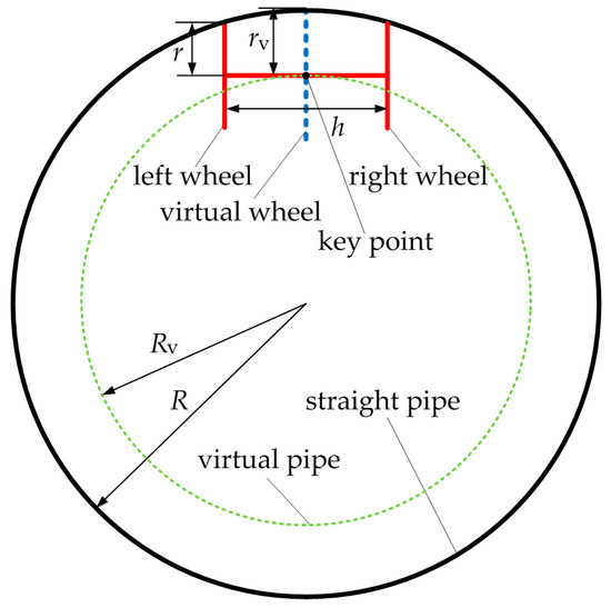 As seen in Figure 3, in the pipeline robot proposed in this paper, one motor drives the two wheels on each side. When the robot moves inside the pipe, it needs to consider the contact between these two wheels and the inner wall of the pipe, complicating the problem. To enable analysis with reasonable complexity, it is possible to simplify this mechanical structure, even at the cost of some accuracy. As illustrated in Figure 6, when the robot moves straight within the pipe, the two wheels on one leg contact the inner wall, and assuming no deformation of the rubber wheels, the contact trajectory between the wheels and the inner wall of the pipe is a straight line parallel to the pipe’s center. Therefore, we can replace the two wheels with a virtual wheel of negligible width and place it in the middle of the output shaft of the locomotion mechanism. By this way, each leg has only one point of contact with the inner wall of the pipe, i.e., a point on the virtual wheel. When conducting dynamic analysis on curved pipes, the same equivalent single virtual wheel is also utilized. It is assumed that at least one point will come into contact with the inner wall of the curved pipe. Furthermore, analyzing the kinematics of robots in curved pipes can be equivalently performed by examining the intersection between the center of the virtual wheel and the virtual pipe. For descriptive convenience, the center of the virtual wheel can be referred to as a key point.