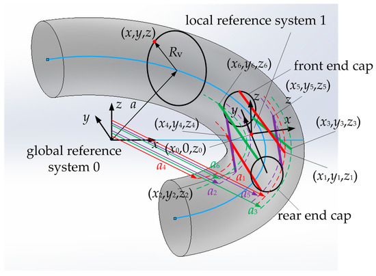 As shown in Figure 7, considering the virtual curved pipe with a radius of RV and a radius of curvature of the pipe centerline of a, it can be set to the global reference system 0 at the center of curvature of the pipe centerline, with the z-axis oriented vertically upwards.
