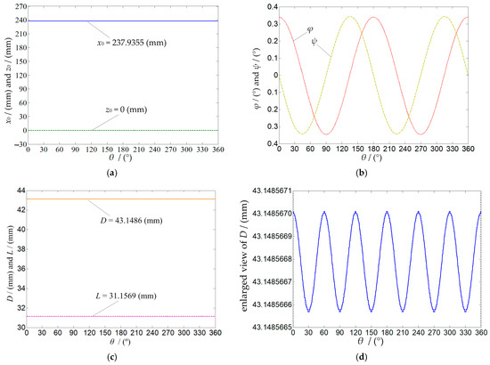 Substituting the structural parameters from Table 1 into Equation (8), solving this equation system is quite challenging. So the numerical method of MATLAB, namely “fsolve”, can be utilized, with initial values preset for the solution. Here, (x0, z0, φ, ψ, D) can be set as (240 mm, 0 mm, 0°, 0°, 30 mm) as initial inputs for “fsolve”, while θ, which indicates the rolling angle of the robot inside the pipeline, can be set for “fsolve” to range from 0° to 360° with a certain step size many times. This will yield a set of non-arrayed kinematic variables. Once solved, the obtained set of kinematic variables can be sorted in ascending order of θ, providing the kinematic variable values for the robot at different θ values. Figure 8 illustrates the variation in other kinematic variables as θ changes from 0° to 360°. Figure 8a indicates that the center of the robot remains essentially stationary but is not on the centerline of the pipeline, which aligns with the actual scenario of the curved pipe. Figure 8b shows that when the robot rolls inside the pipe, it needs to adapt to the size constraints of the curved pipe, resulting in corresponding variations in pitch and yaw. However, these variations are very small and exhibit a certain regularity, resembling a sine wave. Additionally, the amplitudes of the pitch and yaw angles are equal, with a certain phase difference. Figure 8c demonstrates how the proposed robot rolls inside the curved pipe, with the virtual pipe radius remaining constant. This means that the radial motion of the robot is constrained to a circle with a certain radius, and the distance between the front and rear end caps of the robot remains unchanged. In reality, due to slight disturbances in the pitch and yaw angles, the virtual pipe radius is not strictly constant, as depicted in Figure 8d, showing extremely small variations. Although these variations can be negligible, it is worth noting that, due to the slight tilt of the robot inside the pipeline, the circles formed by the three adjacent key points on the same side are not perpendicular to the centerline of the curved pipe. Consequently, the radius D = 43.1486 mm formed by the key points is slightly larger than the calculated virtual radius RV = 42.9634 mm, which is consistent with the actual scenario.