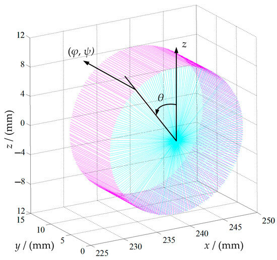 So the coordinates of the i-th (i = 1, 2, 3, 4, 5, 6) key point in global reference system 0 are entirely functions of the kinematic variables (x0, z0, θ, φ, ψ, D). Additionally, the i-th (i = 1, 2, 3, 4, 5, 6) key point lies on the inner wall of the pipe, satisfying the constraint given by Equation (4):