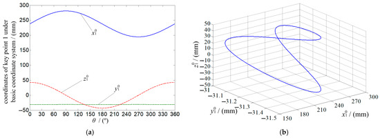 Figure 10 illustrates the relationship between the coordinates of Key Point 1, , in global reference system 0 and the rolling angle θ of the robot. The x and z coordinates can be regarded as the cosine and sine components of a circle, similar to the variation of coordinate components when the robot rotates about a point. Additionally, since only case y0 = 0, where the robot’s center is fixed along the y-direction, is considered, the pose of the robot undergoes only minor fluctuations, resulting in little change in the y-coordinate value of Key Point 1 (Figure 10a). In the three-dimensional coordinate system with the y-direction coordinates magnified, the overall variation in Key Point 1 can be observed (Figure 10b).