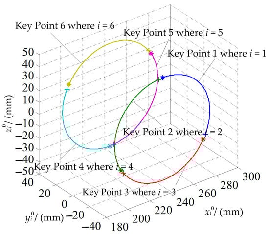Taking Equation (5) and Equation (6) into account, we can obtain the coordinates of the six key points in global reference system 0 as follows:
