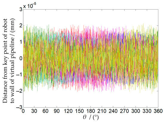 The distance errors between each key point obtained through a numerical solution and the virtual pipe inner wall obtained through ideal assumptions, as they vary with the rolling angle θ, can be calculated. This is shown in Figure 12, where each of the six colors corresponds to one of the six key points. It can be observed that none of the errors exceed 2.5 × 10−5 mm, indicating that the obtained kinematic inverse solution satisfies the constraints (8).