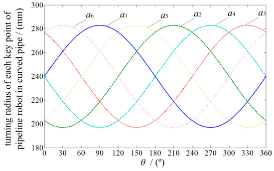 Figure 13 shows the variation of the turning radius of the whole key points of the pipeline robot as the rolling angle θ of the robot increases in the curved pipe. They exhibit a sinusoidal pattern with the same amplitude and frequency, each differing by a phase angle of 60 degrees. This graph also illustrates that in order to prevent the wheels of the pipeline robot from slipping, it is necessary to ensure that the output speeds of the micro DC motors have a ratio of sinusoidal functions.