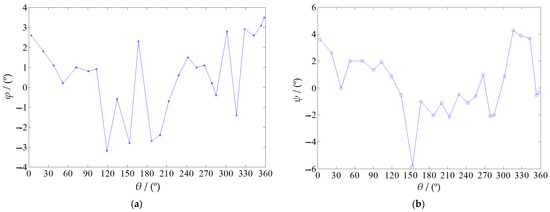 Testing curves of pipeline robot π-II in different postures in the curved pipe: (a) The curve of the robot’s pitch angle φ changing with the roll angle θ; (b) The curve of the robot’s yaw angle ψ changing with the roll angle θ.