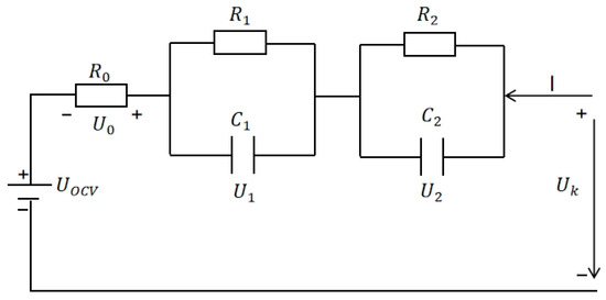 In this paper, the second-order RC equivalent circuit model was selected to model the lithium-ion battery, as shown in Figure 1. In the figure, is the open-circuit voltage of the battery; the open-circuit voltage is defined as the voltage of the battery without the action of an external current; and is the battery terminal voltage. When the battery is working, due to the different formation mechanisms, the internal resistance of the battery is divided into ohmic internal resistance and polarization internal resistance. is the ohm internal resistance of the battery, indicating the resistance of ions during movement, is the voltage at both ends of the ohm capacitance, and I is the current flowing through the equivalent circuit. The internal resistance of the polarization is divided into electrochemical resistance and concentration resistance. is the internal resistance of the electrochemical polarization, is the electrochemical polarization capacitance of the battery, is the internal resistance of the concentration polarization capacitance, is the electrochemical polarization capacitance of the battery, is the voltage at both ends of the electrochemical polarization capacitance of the battery, is the voltage at both ends of the battery concentration polarization capacitor, and the polarization process is used to describe the phenomenon of the transfer, storage, and loss of the internal charge of the battery in the electrolyte during the charging and discharging process of the battery [17].