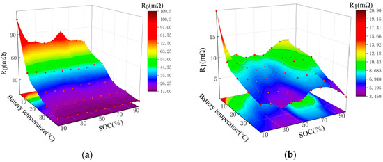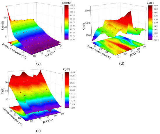 The aforementioned paragraph presents a comprehensive overview of the second-order RC electrophysical model for lithium-ion batteries. As illustrated in Figure 5, a conspicuous trend can be observed, indicating that as the ambient temperature decreases, the internal ohmic resistance, electrochemical internal resistance, and concentration polarization internal resistance of lithium-ion batteries increase. This, in turn, signifies that as the temperature decreases, the resistance of the battery-charging process increases, thereby causing a significant reduction in charging efficiency. Notably, a sharp increase in the internal resistance of the battery occurs when the state of charge reaches 10%.