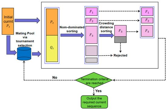 In this paper, the charging time, charging efficiency, and rise in the battery temperature of lithium batteries are used as the objective functions of the charging strategy, and the three objective functions are mutually restricted, so it is impossible to optimize a single objective function. Therefore, it is necessary to introduce a multi-objective optimization method. This paper uses the NSGA-II algorithm to solve the multi-objective optimization problem, considering that there are many objectives and that the mutual constraints are complex. The specific flow of the algorithm is shown in Figure 6.