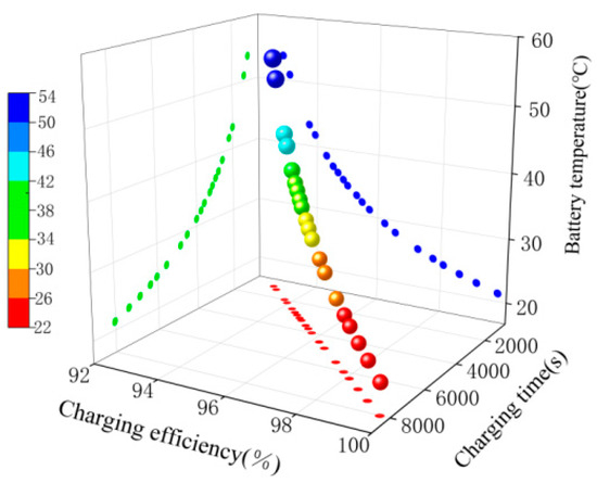 The Pareto frontier is derived from the combination of the objective function and constraints of the optimization algorithm, as illustrated in Figure 7. The objective function, which encompasses charging time, charging efficiency, and rising battery temperature, exhibits mutual dependency among its components. The points on the Pareto front surface represent the optimal solutions achieved by balancing and emphasizing the objective function. An appropriate solution can be selected depending on the varying emphasis placed on the objective function. Consequently, based on the distinct focus accorded to the objective function, four representative charging ratios are chosen for the experiment’s charge and discharge current. These ratios are 0.7C, 1.2C, 1.9C, and 2.9C, corresponding to strategies 1, 2, 3, and 4, respectively. Strategy 1 features the lowest charge–discharge ratio and longest charging time, while Strategy 4 presents the highest charge–discharge ratio and shortest charging time.