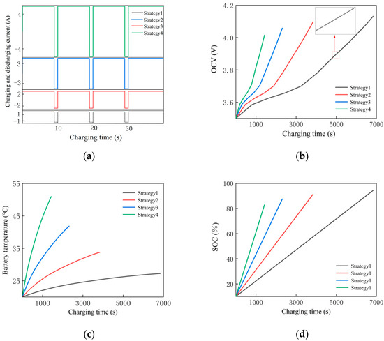 Figure 8 compares the charging time, charging efficiency, and increase in battery temperature for the four charging strategies. As the charging ratio increases, the battery’s charging state gradually decreases after reaching the cut-off voltage. The charging state of Strategy 4 is only 83.14%, while that of Strategy 1 is 94.42%.