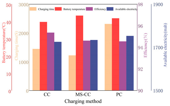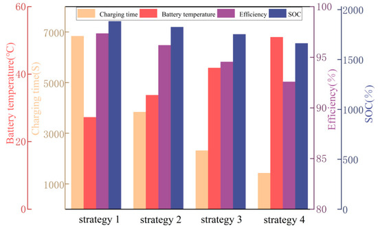 A multi-Y-axis bar chart of the different strategies is presented in Figure 9. Comparing the four charging strategies, the charging efficiency gap is small. Given the importance of charging time, the charging and discharging ratio of Strategy 3 is more reasonable, as it considers both factors of battery temperature rise and battery charging state.