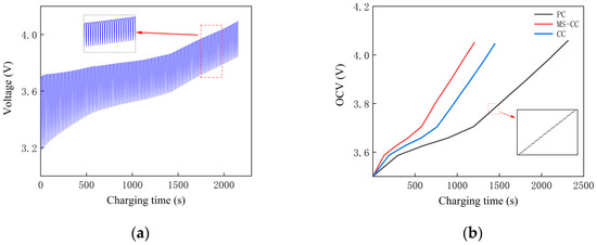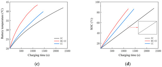 This section compares the effects of CC, MS-CC, and PC charging methods on the amount of charge, temperature increase, and battery charging time. The charging current of Strategy 3 is used as the multiplier of these three charging methods. The terminal voltage, open-circuit voltage (OCV), state of charge (SOC), and temperature rise curves of the battery during the whole charging process are shown in Figure 10.
