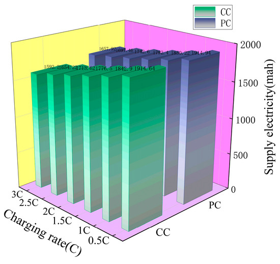 To further compare the acceptance of electrical energy between constant-current (CC) charging and pulsed-current (PC) charging strategies, a total of six experiments were conducted with a gradient of 0.5C and a cut-off voltage of 4.2 V. As depicted in Figure 12, there was minimal discrepancy in the amount of charge of the battery under the condition of 0.5C. As the charging ratio gradually increased, the benefits of the PC charging mode became increasingly apparent. When the charging rate reached 3C, the PC charging method provided a charging efficiency 3.54% higher than that of the CC charging method.